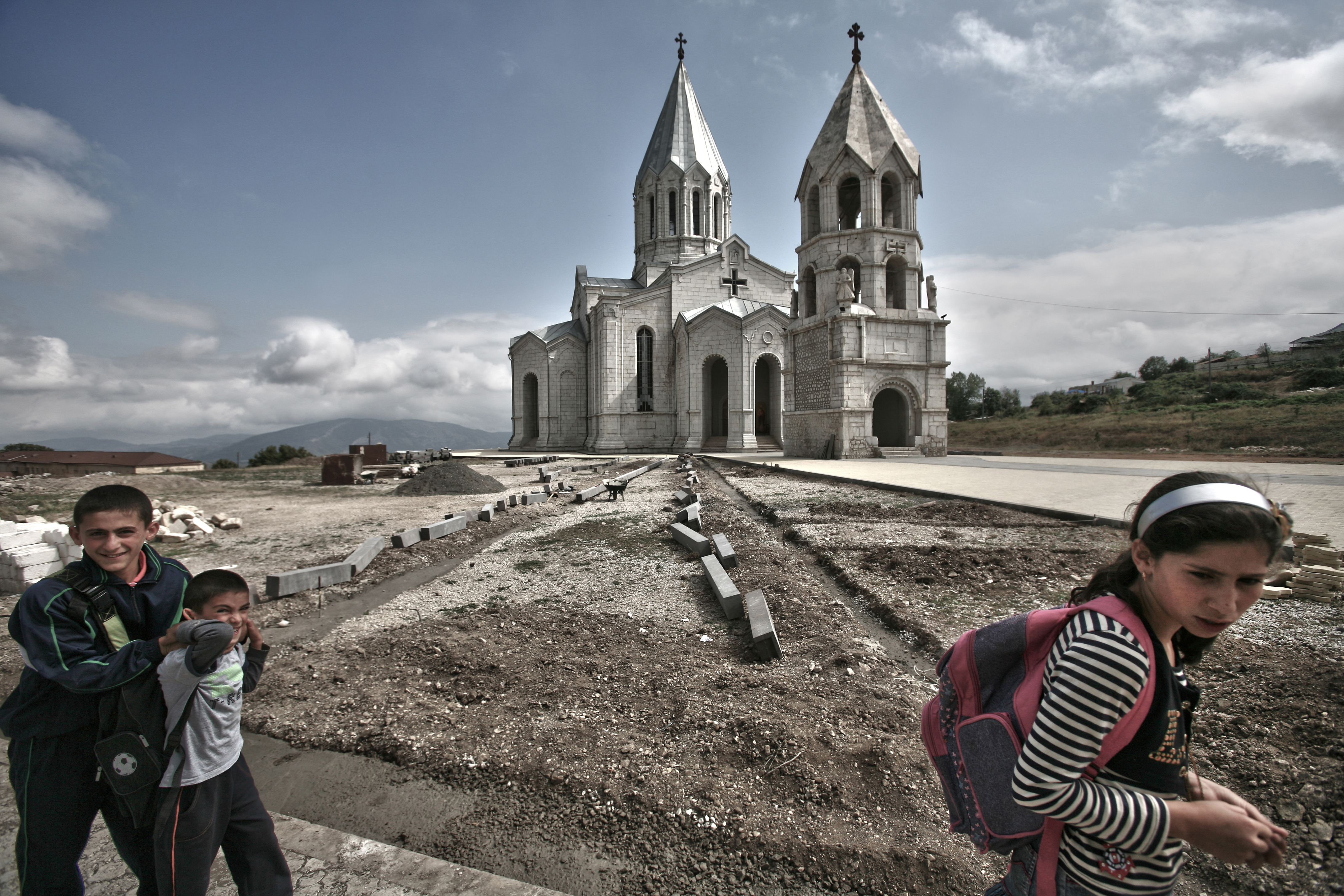 Nagorno-Karabakh   Children play near the Ghazanchetsots Cathedral in the city of Shushi, the diocese of the Armenian Apostolic Church from the Artsakh region. Built between 1868-1887, the cathedral suffered much deteriorations during the Armenian-Azeri conflicts. Freshly reconstructed, it becamed the pride of Shushi and a stimulus for the reconstruction of the entire area. Shushi, Nagorno-Karabakh, 18 September 2008.