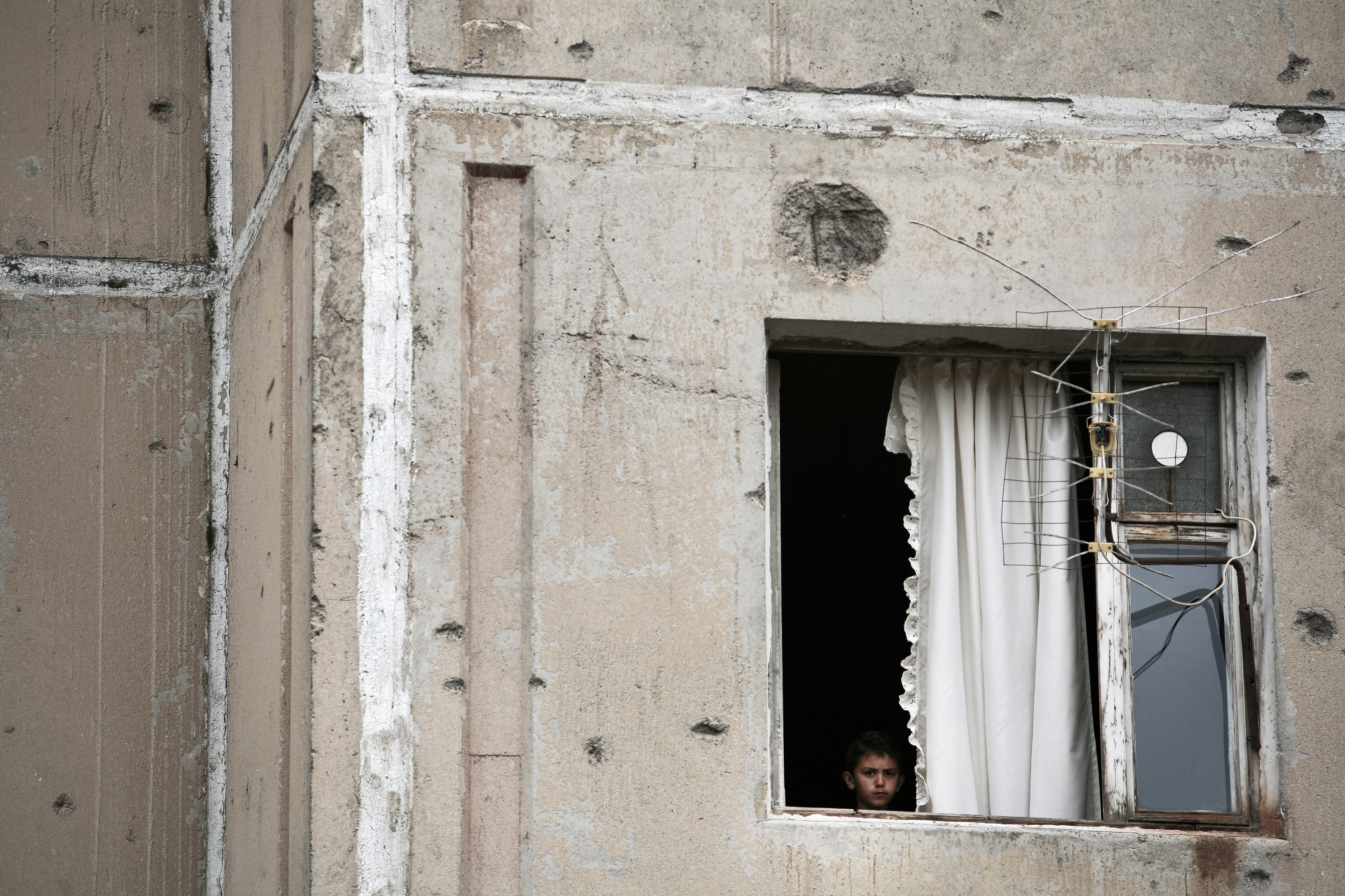 Nagorno-Karabakh   A boy watches from his apartment's window situated in a building damaged during the war period, in Khojaly city, Nagorno-Karabakh. The city is a military base, situated near the border with Azerbaijan and 10 km Northeast of the capital Stepanakert. The city is known for the Khojaly Massacre committed on 25–26 February 1992 by the Armenian and, partially, by CIS armed forces (the Russian 366th Motor Rifle Regiment) during the Nagorno-Karabakh War. Khojaly, Nagorno-Karabakh, 19 September 2008.